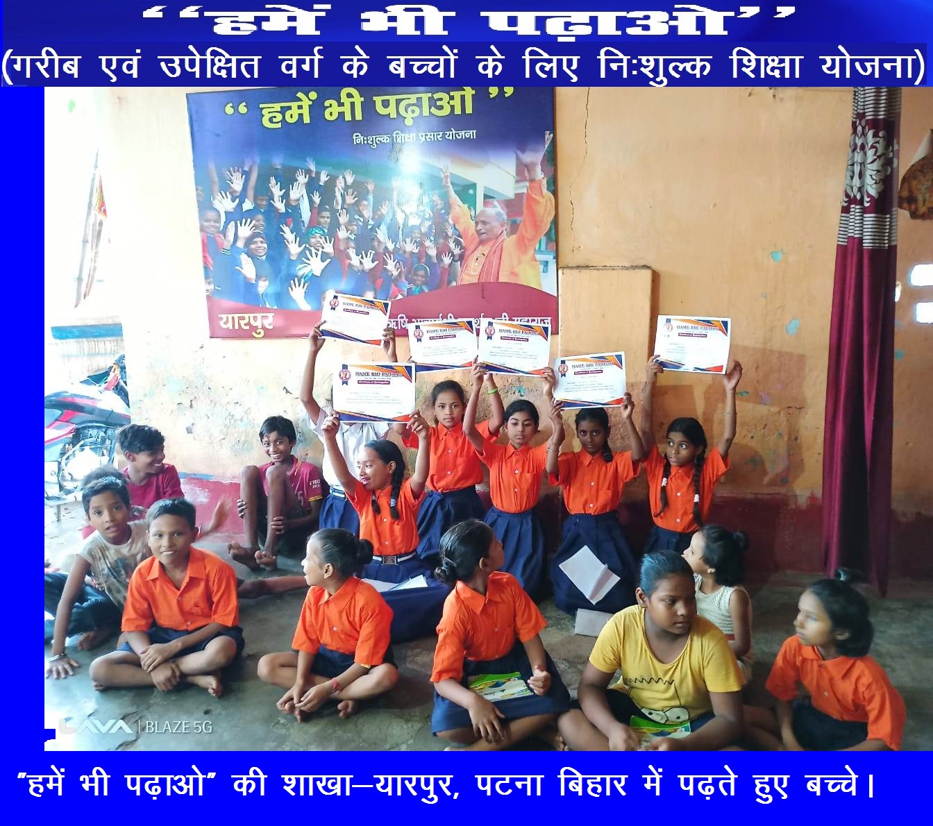 "हमें भी पढ़ाओ" कार्यक्रम के इस छोटे से पौधे की नीव जगजीवन नगर, चितकोहरा में पड़ी थी, जिसे आज आचार्यश्री के आशीर्वाद एवं फाउंडेशन के निदेशक श्री बी० के० सुदर्शन व संस्था के सचिव डॉ० कुमार अरुणोदय ने अपनी लगन एवं मेहनत से सींच कर वटवृक्ष बना दिया हैं और जिसकी शाखाएं निरंतर बढ़ती हुईं बिहार ही नहीं बल्कि झारखण्ड, उत्तरांचल, हरियाणा, दिल्ली आदि प्रदेशों में फैलती जा रही है I इस वटवृक्ष की छाया तलें हज़ारों बेसहारा, अशिक्षित एवं बेराजगार बच्चें लाभान्वित हो रहें है I कल तक अशिक्षा के अंधकार में भटकते ये बच्चें समाज के लिए अभिशाप थे लेकिन आज यही बच्चें केंद्र से शिक्षा ग्रहण कर समाज की मुख्य धारा से जुड़ते जा रहे है I l