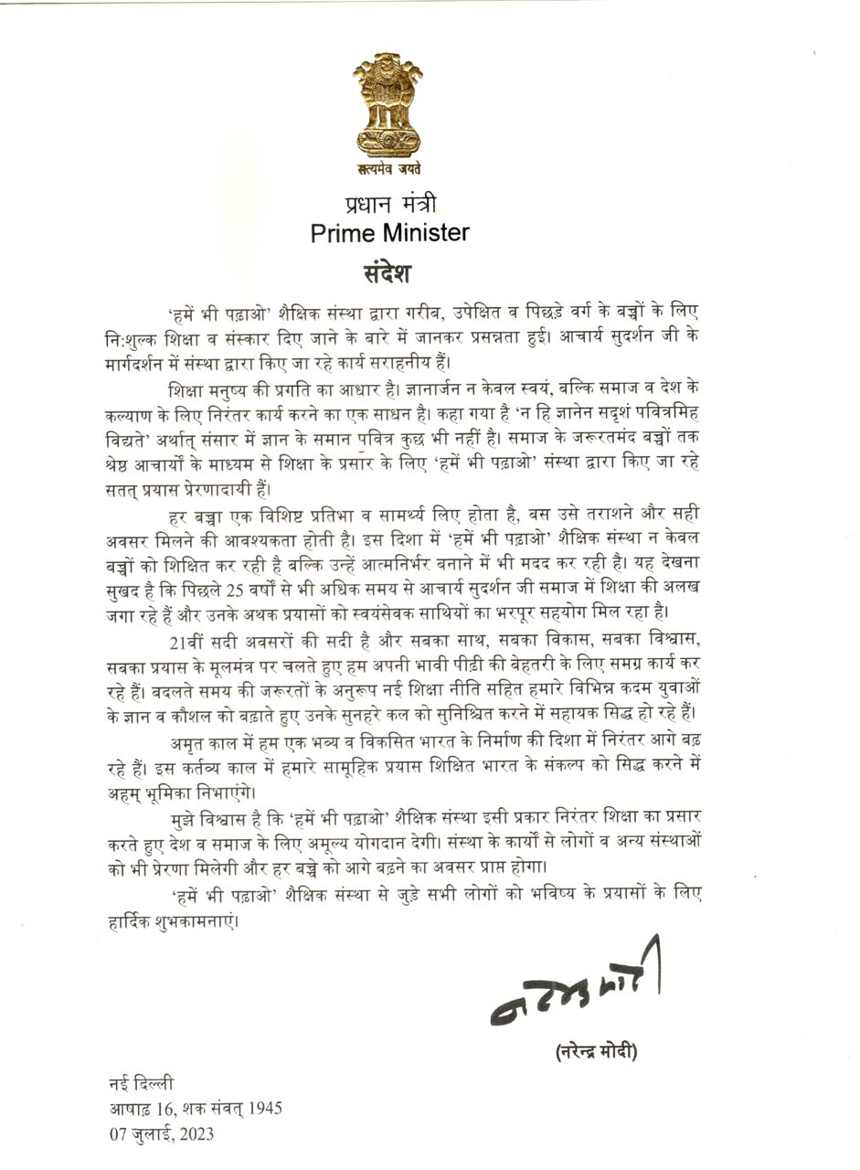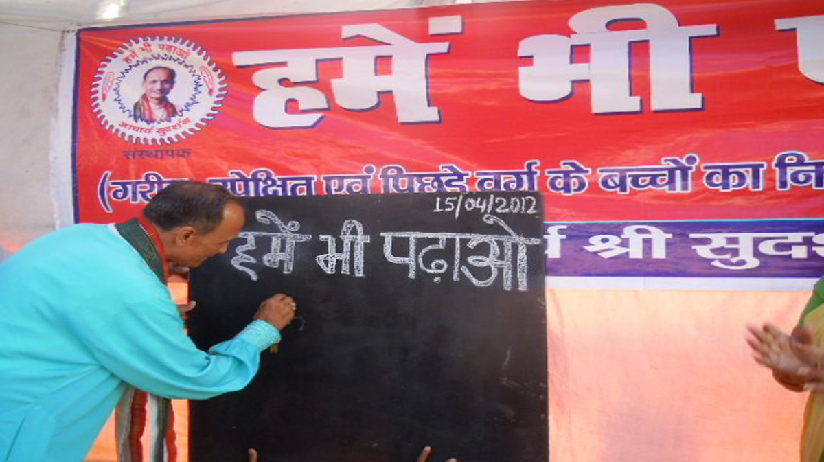 "हमें भी पढ़ाओ" शिक्षा क्रांति की बुनियाद २००१ में पटना के चितकोहरा मुहल्ले के स्लम क्षेत्र में उस वक़्त पड़ी जब एक अशिक्षित परिवार को जिंदगी के आभाव से जुझते एवं नारकीय जीवन जीते देखा l इनके नंग-धरंग कई बच्चों को खाना के लिए लड़ते और जीर्ण कायायुक्त पत्नी को अपने एवं बच्चों के नसीब पर सिसकते देख शिक्षा जगत के प्रख्यात गुरु आचार्यश्री सुदर्शन जी महाराज ने संकल्प लिया की शिक्षा रूपी जो पूंजी है उसे ही माध्यम बना कर अभावो से जुझते वैसे परिवारों को इस दलदल से निकालने का प्रयत्न करूँगा l और इस प्रकार "हमें भी पढ़ाओ" का पहला केंद्र उस जगह खोला गया l