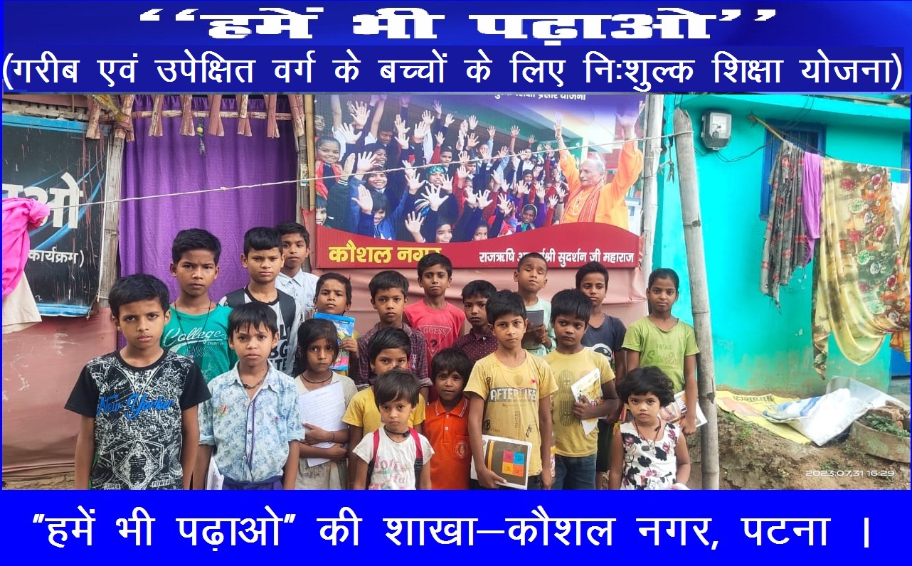 "हमें भी पढ़ाओ" शिक्षा क्रांति की बुनियाद २००१ में पटना के चितकोहरा मुहल्ले के स्लम क्षेत्र में उस वक़्त पड़ी जब एक अशिक्षित परिवार को जिंदगी के आभाव से जुझते एवं नारकीय जीवन जीते देखा l इनके नंग-धरंग कई बच्चों को खाना के लिए लड़ते और जीर्ण कायायुक्त पत्नी को अपने एवं बच्चों के नसीब पर सिसकते देख शिक्षा जगत के प्रख्यात गुरु आचार्यश्री सुदर्शन जी महाराज ने संकल्प लिया की शिक्षा रूपी जो पूंजी है उसे ही माध्यम बना कर अभावो से जुझते वैसे परिवारों को इस दलदल से निकालने का प्रयत्न करूँगा l और इस प्रकार "हमें भी पढ़ाओ" का पहला केंद्र उस जगह खोला गया l