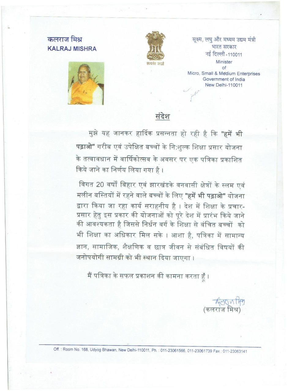 "HAMEIN BHI PADHAO" a scheme for spreading the light of education, is not any program as such it is virtually a thought revolution, Secondly this thought revelution is not any movement for that matter rather it is an honest effort which aims at relating a man to the other by breaking open the feelings of inferiority complex to one another and then infusing into each and every man/women a healthy ideology and self respect. As a matter of fact, every society is tied in the bond of some traditionally popular beliefs of norms.